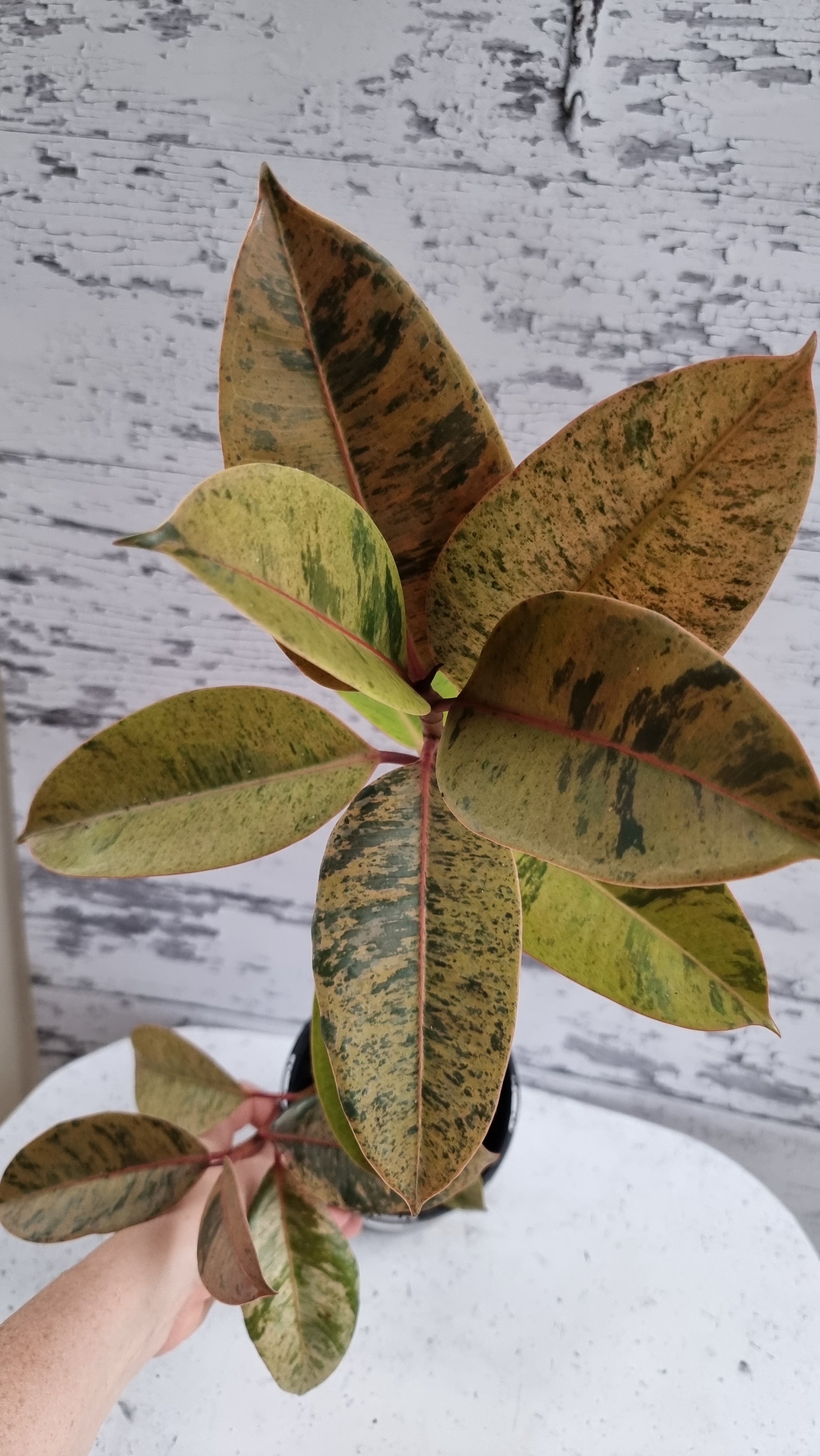 Of all the Ficus Elastica varieties this one is a showstopper! This plant is an array of bright pastel colours all year round with its stunning foliage. Its rubbery leaves are beautifully variegated with speckles of lime and dark green, new growth emerges a beautiful shade of peachy pink and fades to green as the leaf matures.