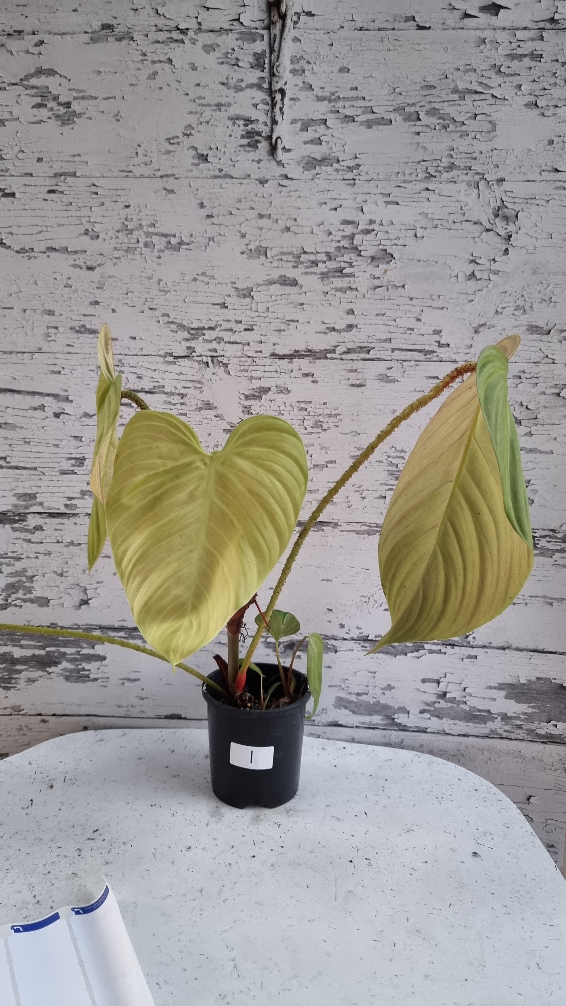 Stunning billowy, heart-shaped leaves that are on the rounder side. Hairy, red petioles and a satin leaf sheen are standout features for this plant. Very fast growing in the right conditions, this plant loves to climb or 'run' along the soil surface and will grow leaves up to 60cm long.