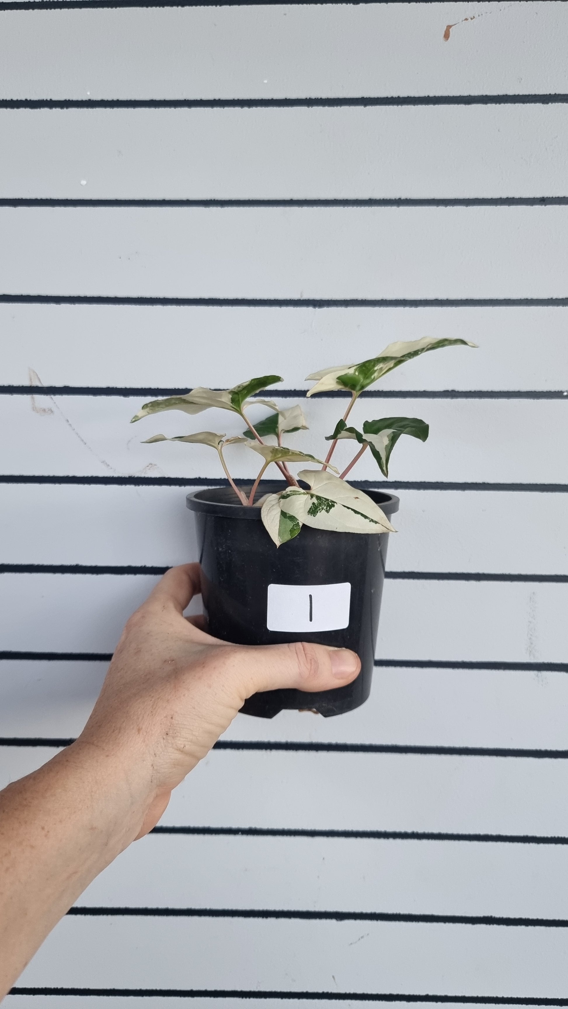 The variegated Syngonium have lovely white solid and marbling across the leaves. With a little sun the stems can turn pink offering a lovely contrast. Syngonium love to climb and will latch onto whatever is provided with their aerial roots. The plants priced based on their size (number of nodes) and level of variegation.